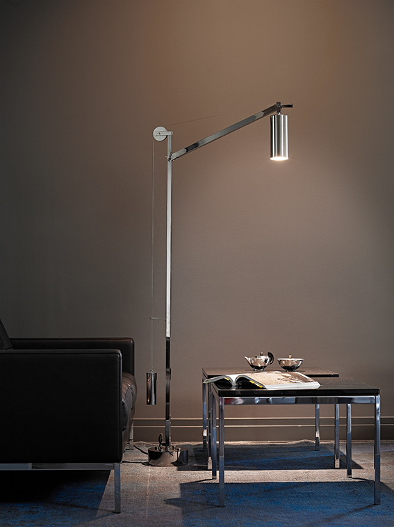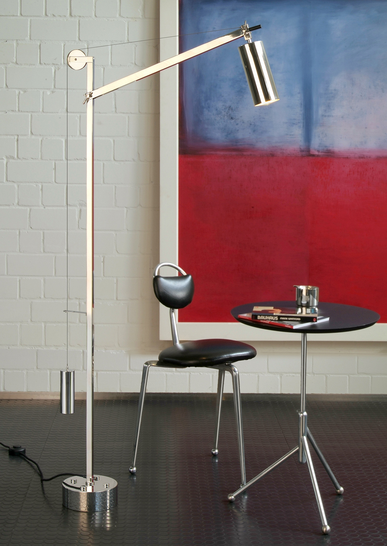 Wer die skulptural wirkende Leuchte um 1923 entworfen hat, ist unbekannt – auf jeden Fall war es jemand mit einer Schwäche für Mechanik, denn der Leuchtenarm lässt sich durch ein Gegengewicht ausrichten. Klar ist auch, dass die Stehleuchte im Umfeld des Bauhauses entstanden sein muss.