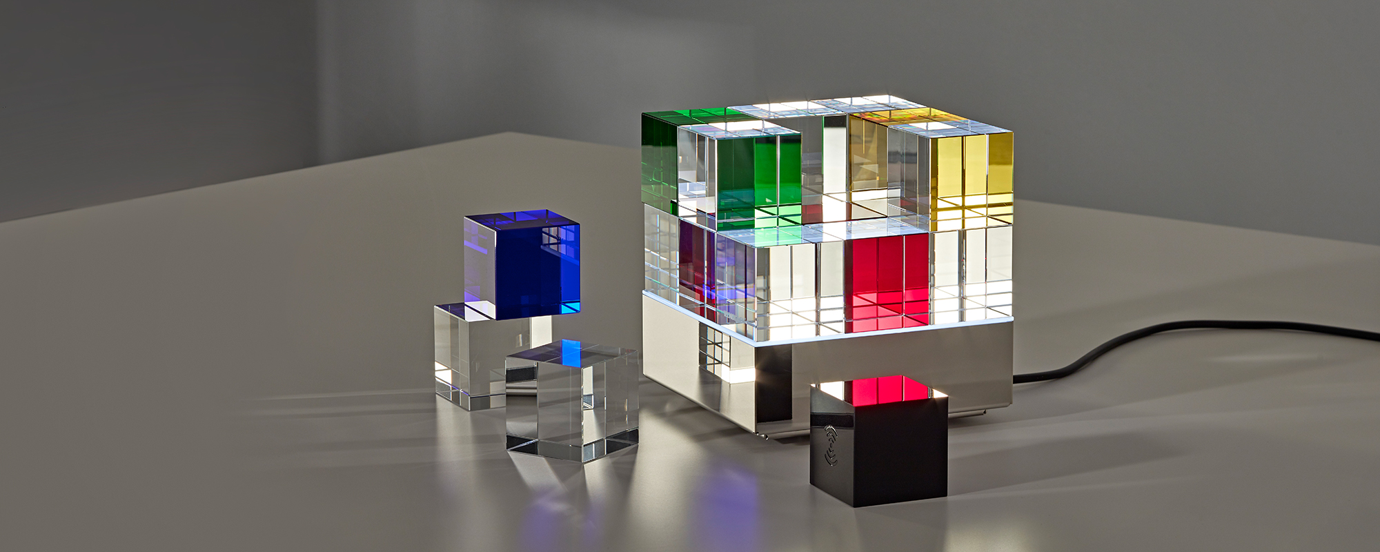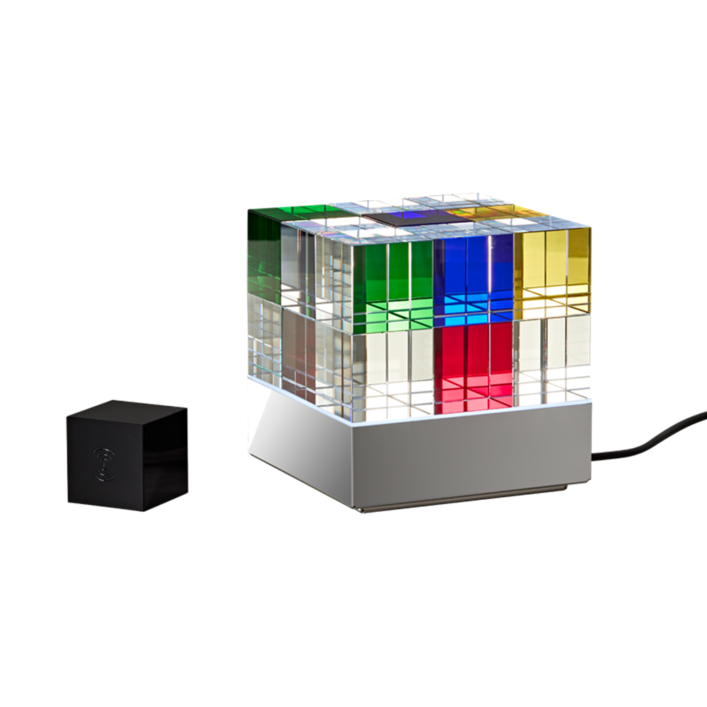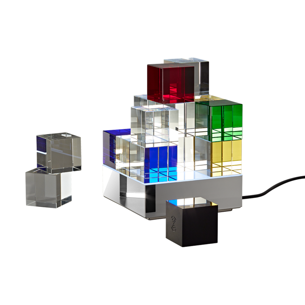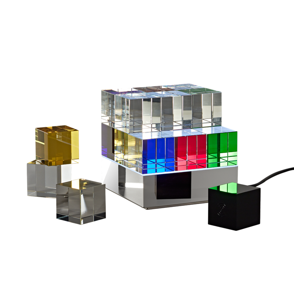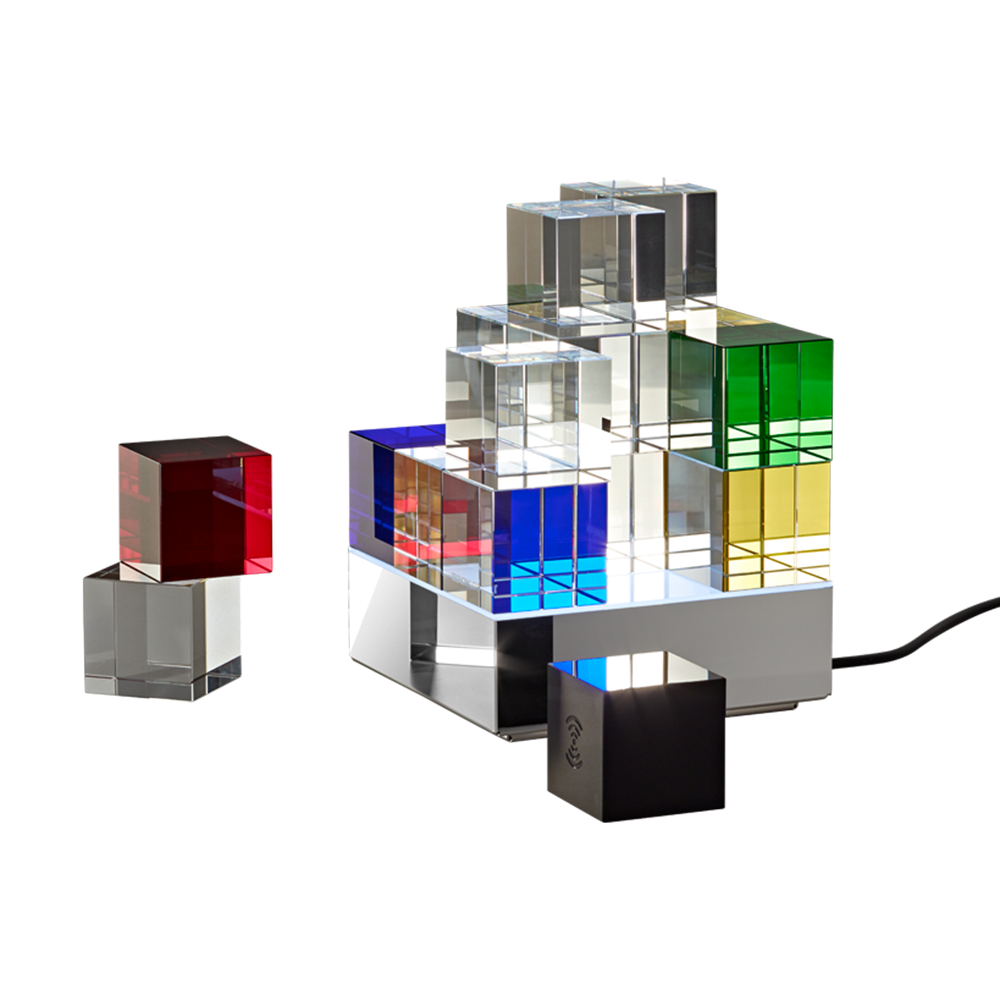 Dieser Designklassiker orientiert sich an der Bauhaus Architektur und erlaubt unendlich viele geometrische Gestaltungsmöglichkeiten und Farbkombinationen. Das klare und reduzierte Design bewirkt eine zeitlose Erscheinung, die durch die verwendeten klassischen Materialien Glas und Edelstahl unterstrichen wird. Durch die in Handarbeit eingebrachten Kantenschliffe der Glaswürfel und die neuartige indirekte LED Beleuchtung entstehen, selbst im ausgeschalteten Zustand, vielfältige Lichtreflektionen und Lichtspiele, welche die Fantasie und die Faszination an dieser neuartigen Designleuchte anregen.