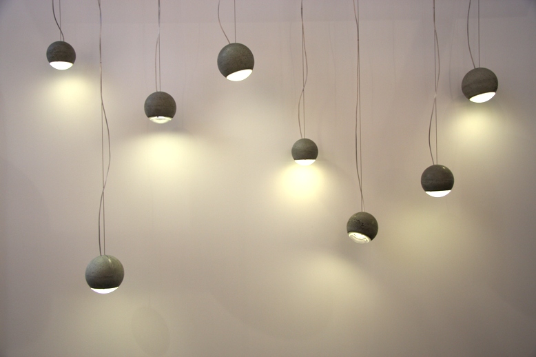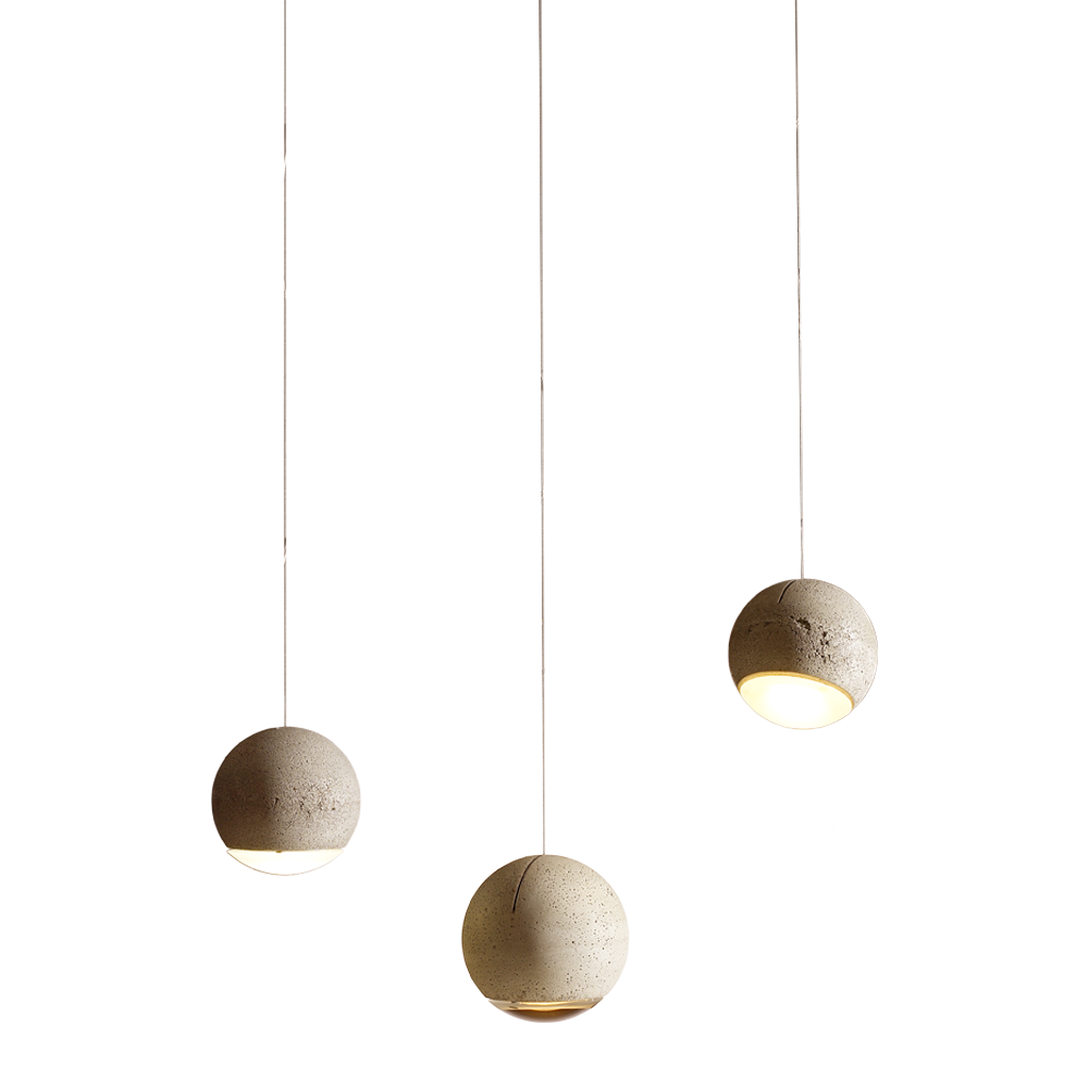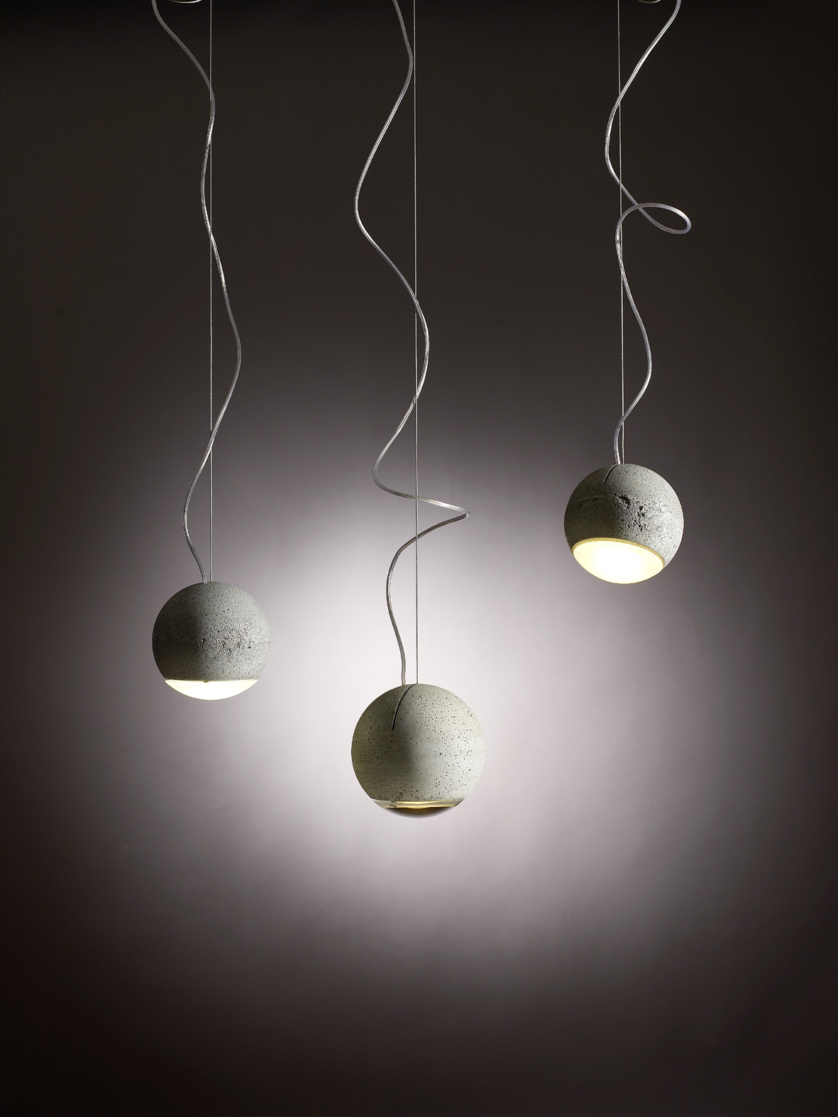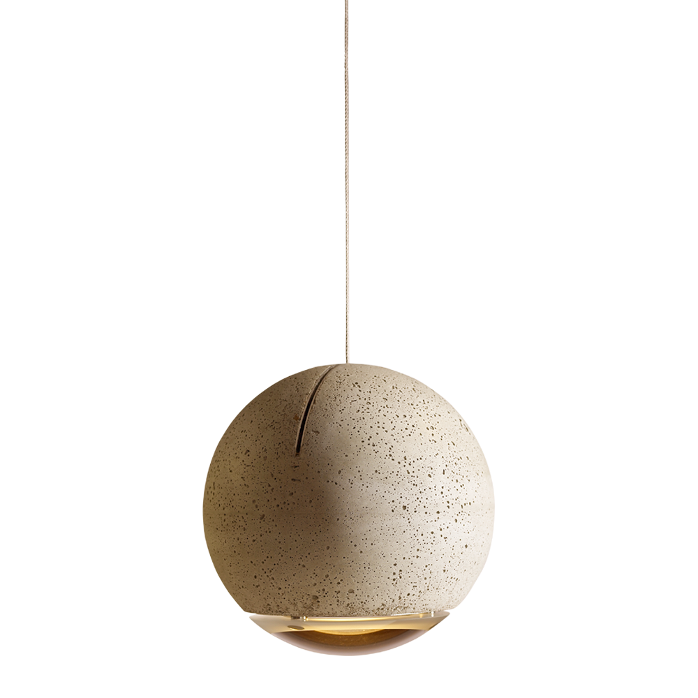 An einem dünnen Drahtseil hängt eine Betonkugel, an deren Unterseite ein Segment durch eine hochwertige Die Absicht des Designers ist es, auf eine maschinelle Verdichtung des Betons zu verzichten. Stattdessen wird der Beton von Hand gegossen und auch verdichtet, so dass die sehr glatte Kugeloberfläche von Lunker und Lufteinschlüssen unregelmäßig durchsetzt ist. Diese unterschiedliche, lebendige Oberflächenbeschaffenheit der einzelnen Betonkörper macht aus jedem Exemplar ein Leuchtenunikat.
