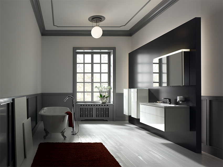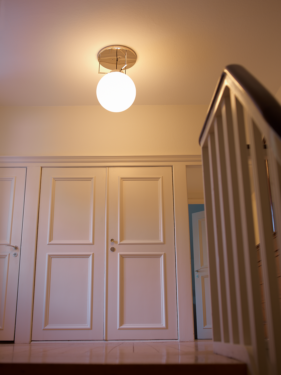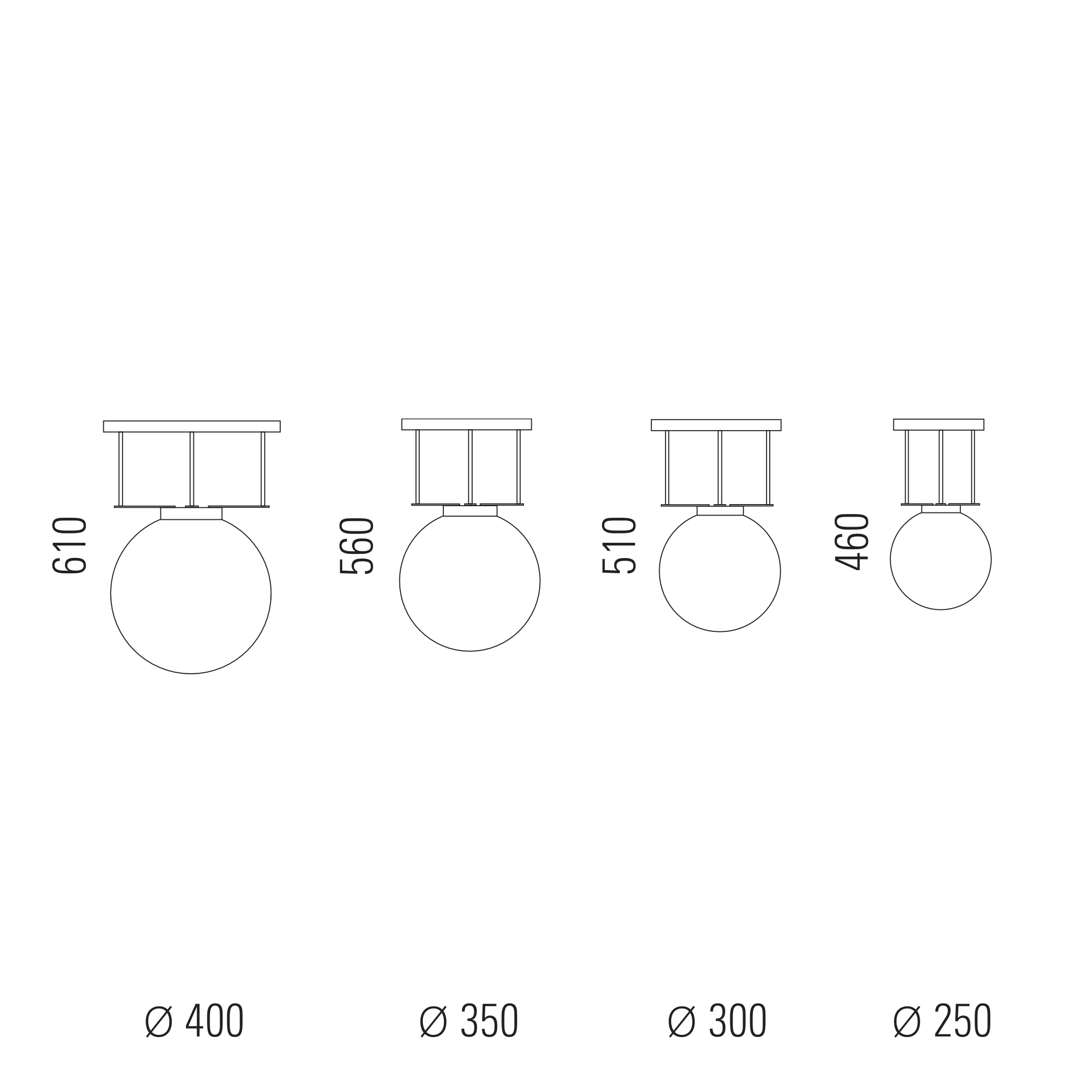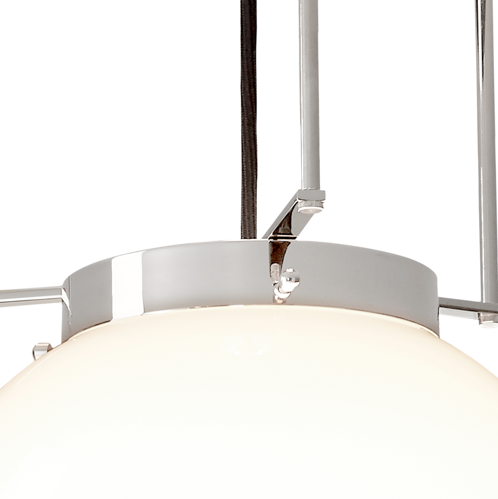 Die wahlweise 250mm, 300mm, 350mmm oder 400mm große Opalkugel wird durch drei Stäbe und einen Ring als Haltevorrichtung an der Deckenplatte gehalten, die das Licht der Kugel reflektiert (2,7 kg (Ø 250mm), 4,1 kg (Ø 300mm), 4,4 kg (Ø 350mm), 7,0 kg (Ø 400mm).