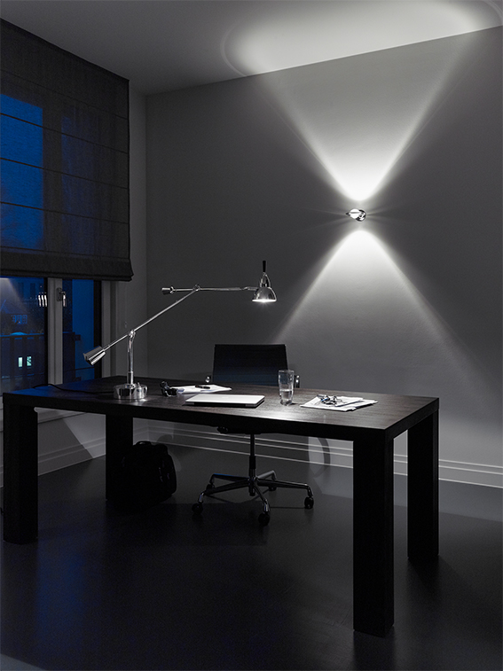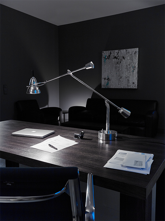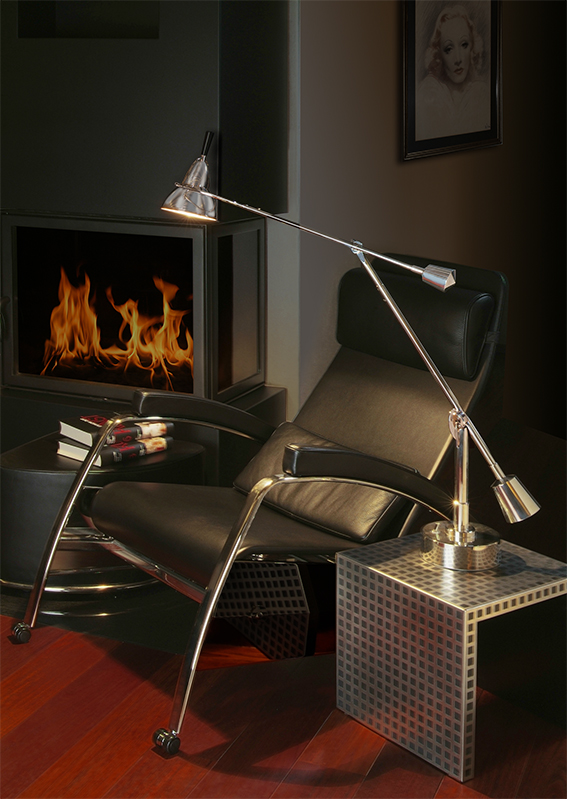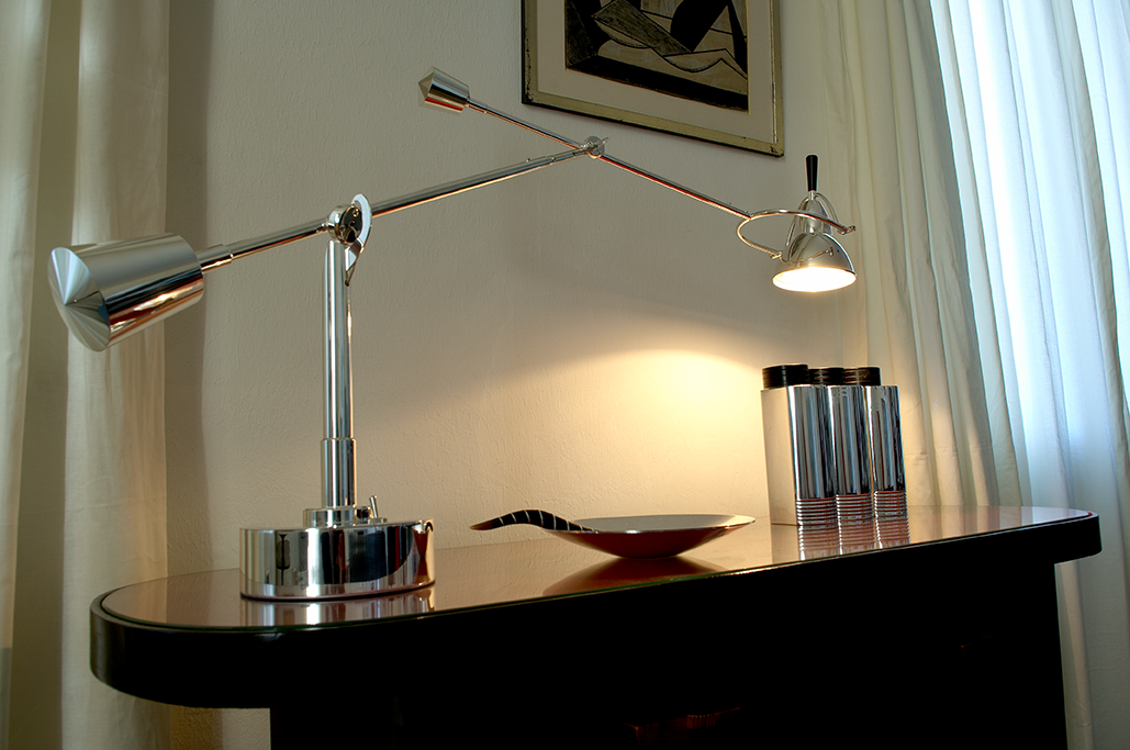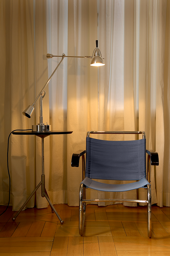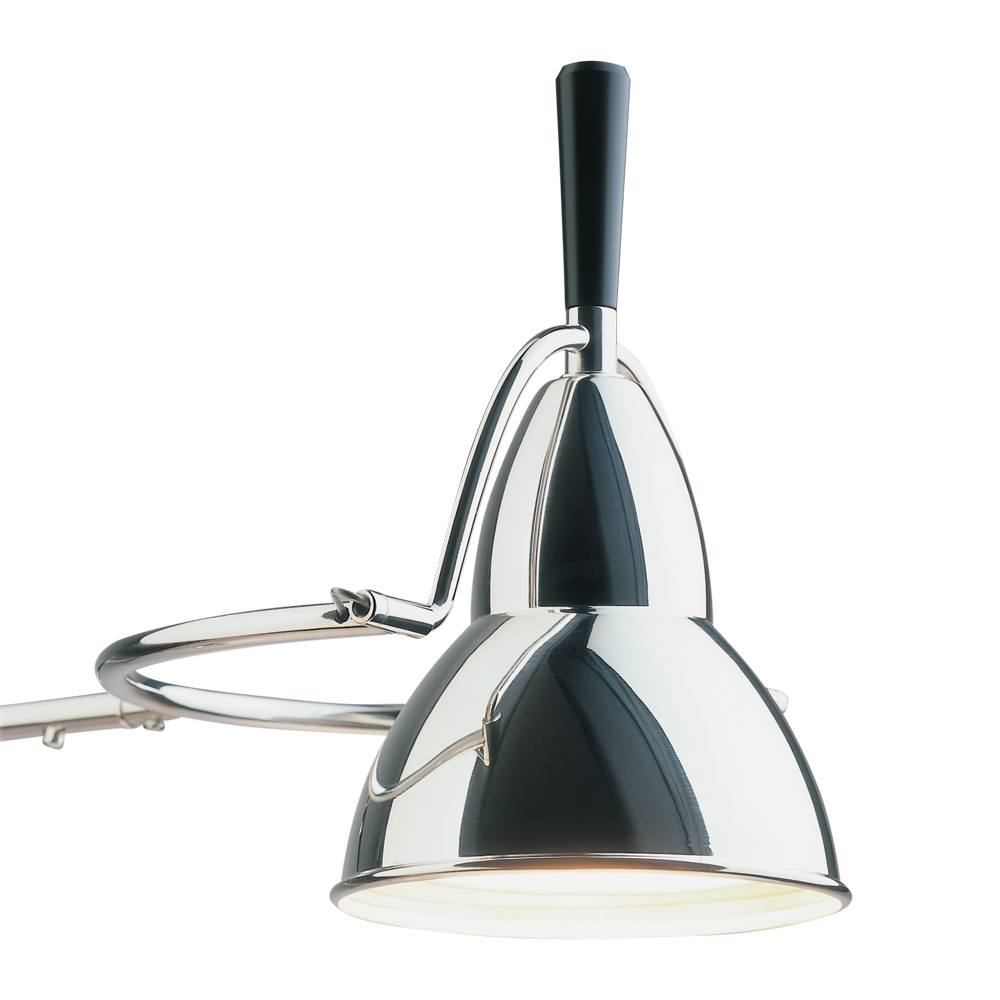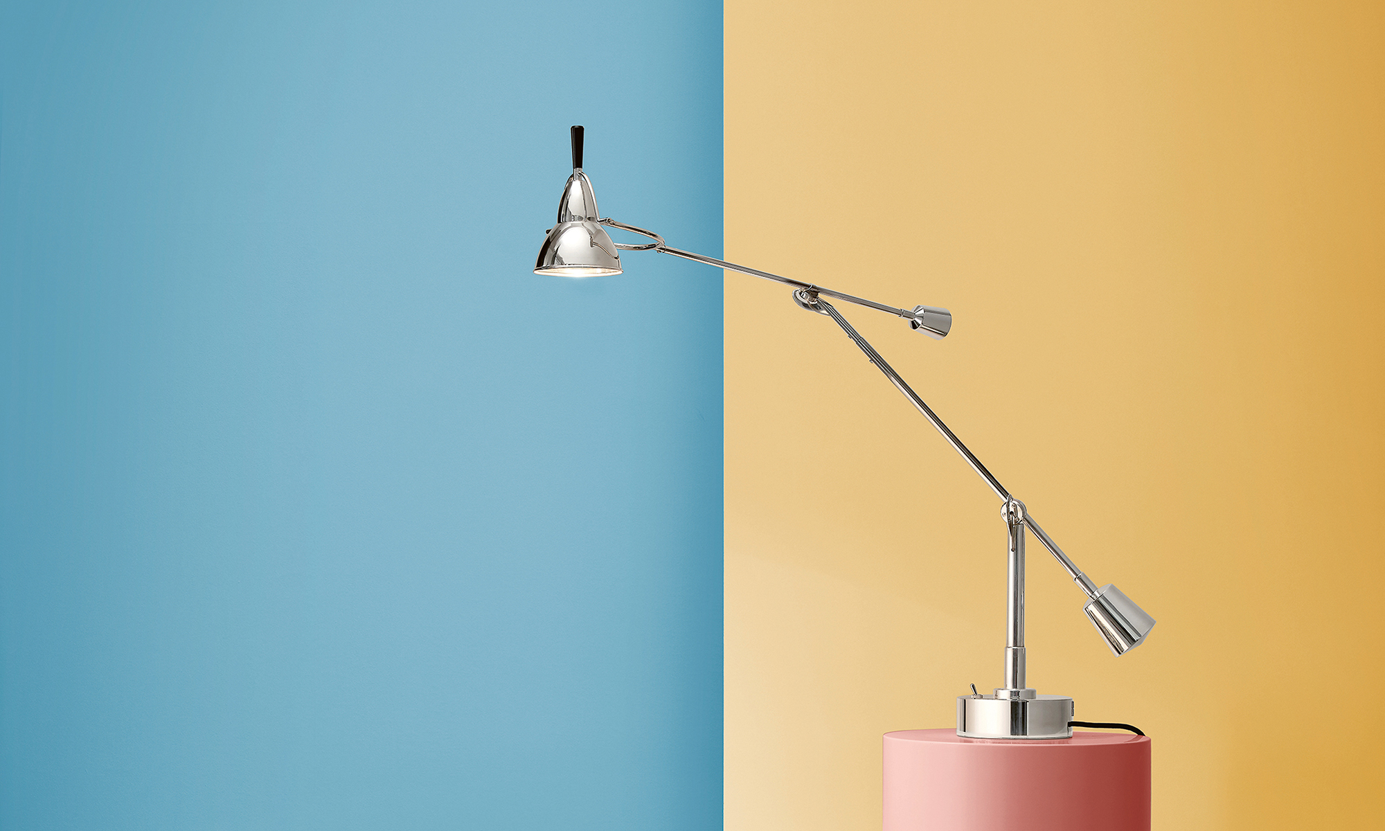 Der Ingenieur Édouard-Wilfrid Buquet interpretiert die Suche nach dem Gleichgewicht in seiner Leuchte von 1927 als eine Gewichtsverlagerung. Sachlich beschreibt er diese poetische Verschiebung von Licht in seiner Patentschrift als „orientierbaren Beleuchtungskörper mit Gelenkarmen“. Praktisch bedeutet diese Konstruktion die Möglichkeit, den Leuchtkopf durch kleine Verlagerung der Gewichte in nahezu jede erdenkliche Position zu bewegen.