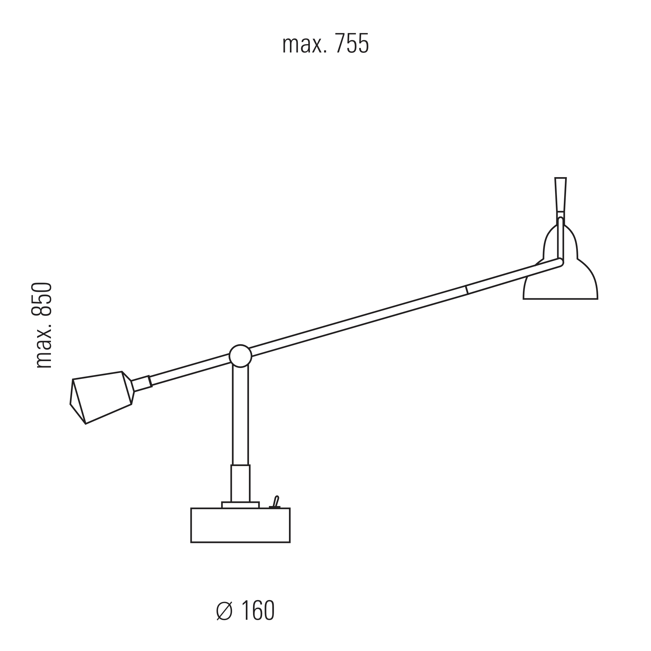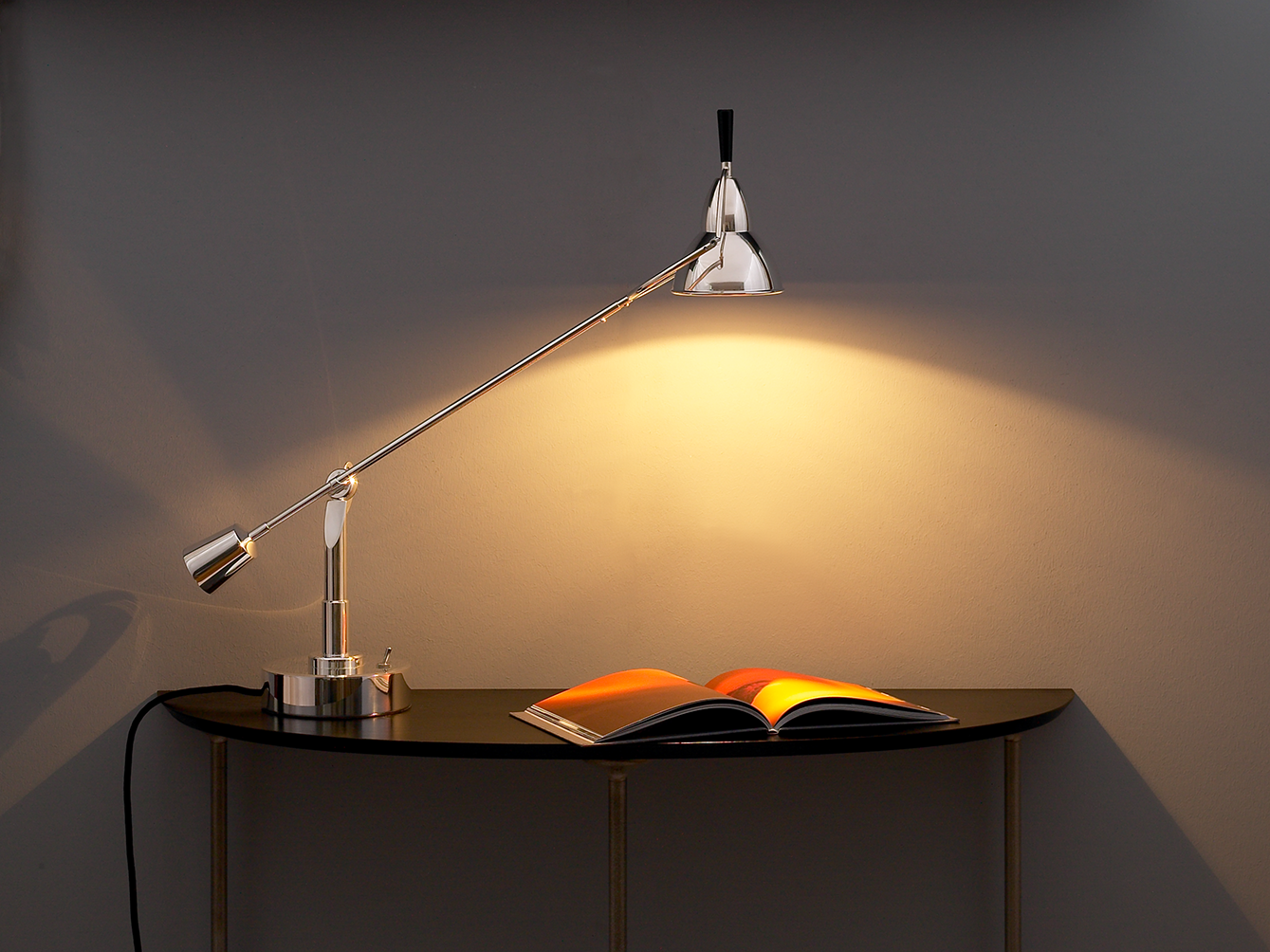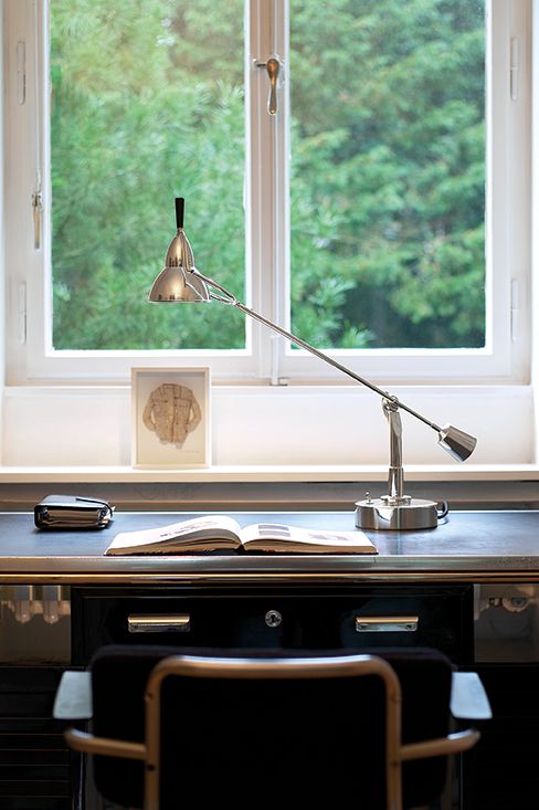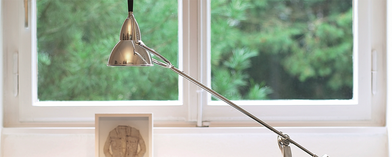 Der Ingenieur Édouard-Wilfrid Buquet interpretiert die Suche nach dem Gleichgewicht in seiner Leuchte von 1927 als eine Gewichtsverlagerung. Sachlich beschreibt er diese poetische Verschiebung von Licht in seiner Patentschrift als „orientierbaren Beleuchtungskörper mit Gelenkarmen“. Praktisch bedeutet diese Konstruktion die Möglichkeit, den Leuchtkopf durch kleine Verlagerung der Gewichte in nahezu jede erdenkliche Position zu bewegen.
