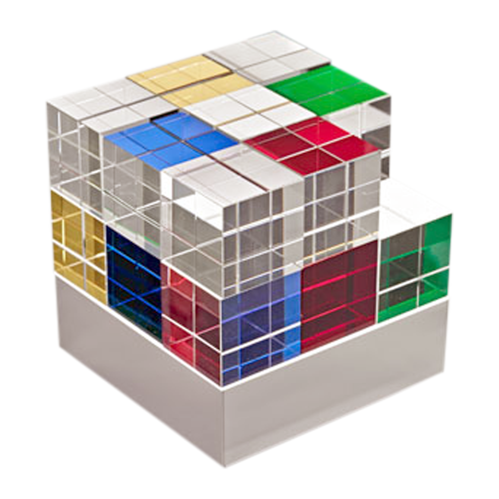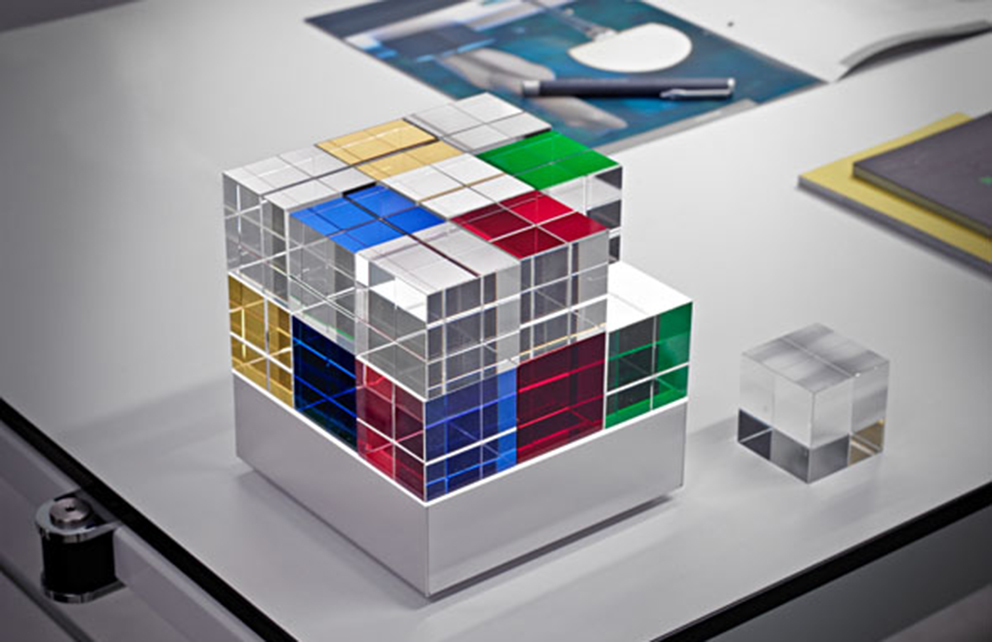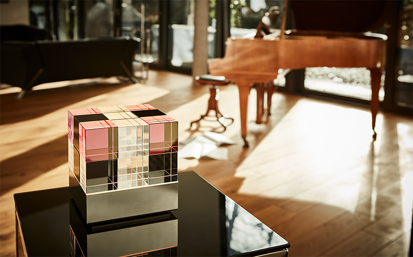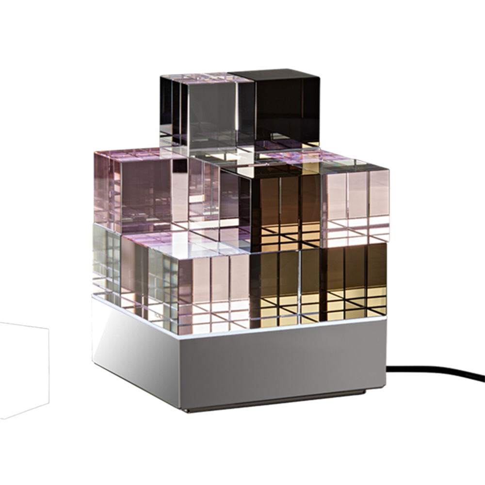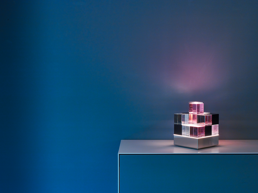 Die puristische Erscheinung ist dennoch stets nach Stimmungslage und persönlichem Geschmacksempfinden des Besitzers veränderbar, was auch jederzeit den fließenden Wechsel von der Wohnraumambienteleuchte zum Licht- und künstlerischen Designobjekt erlaubt. Durch die in Handarbeit eingebrachten Facetten- und Kantenschliffe der Glaswürfel und die neuartige indirekte LED Beleuchtung entstehen, selbst in ausgeschaltetem Zustand, vielfältige Lichtreflektionen und Lichtspiele, welche die Fantasie und die Faszination an dieser neuartigen Design- Ambienteleuchte anregen.