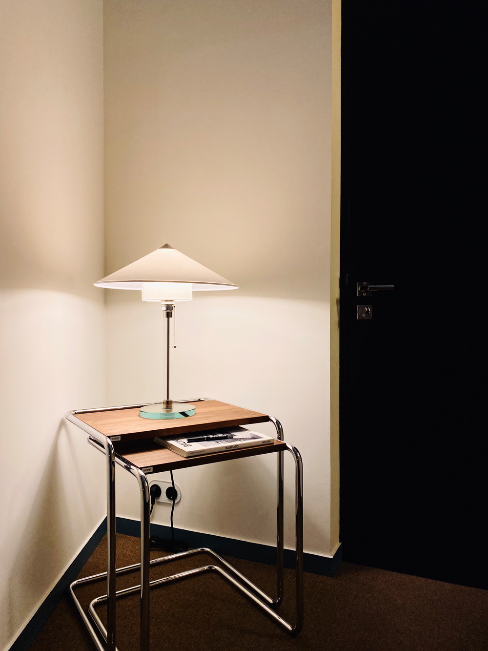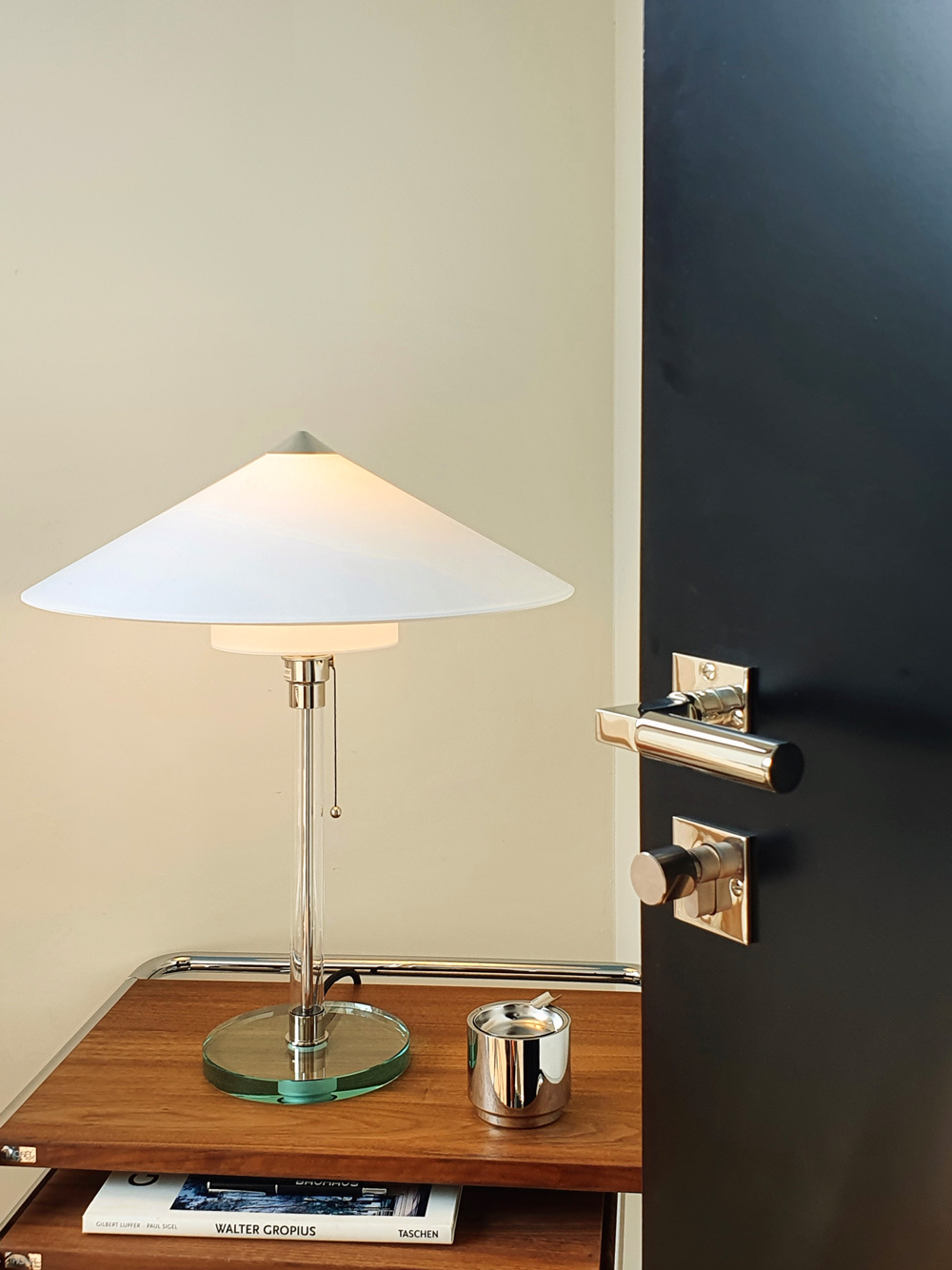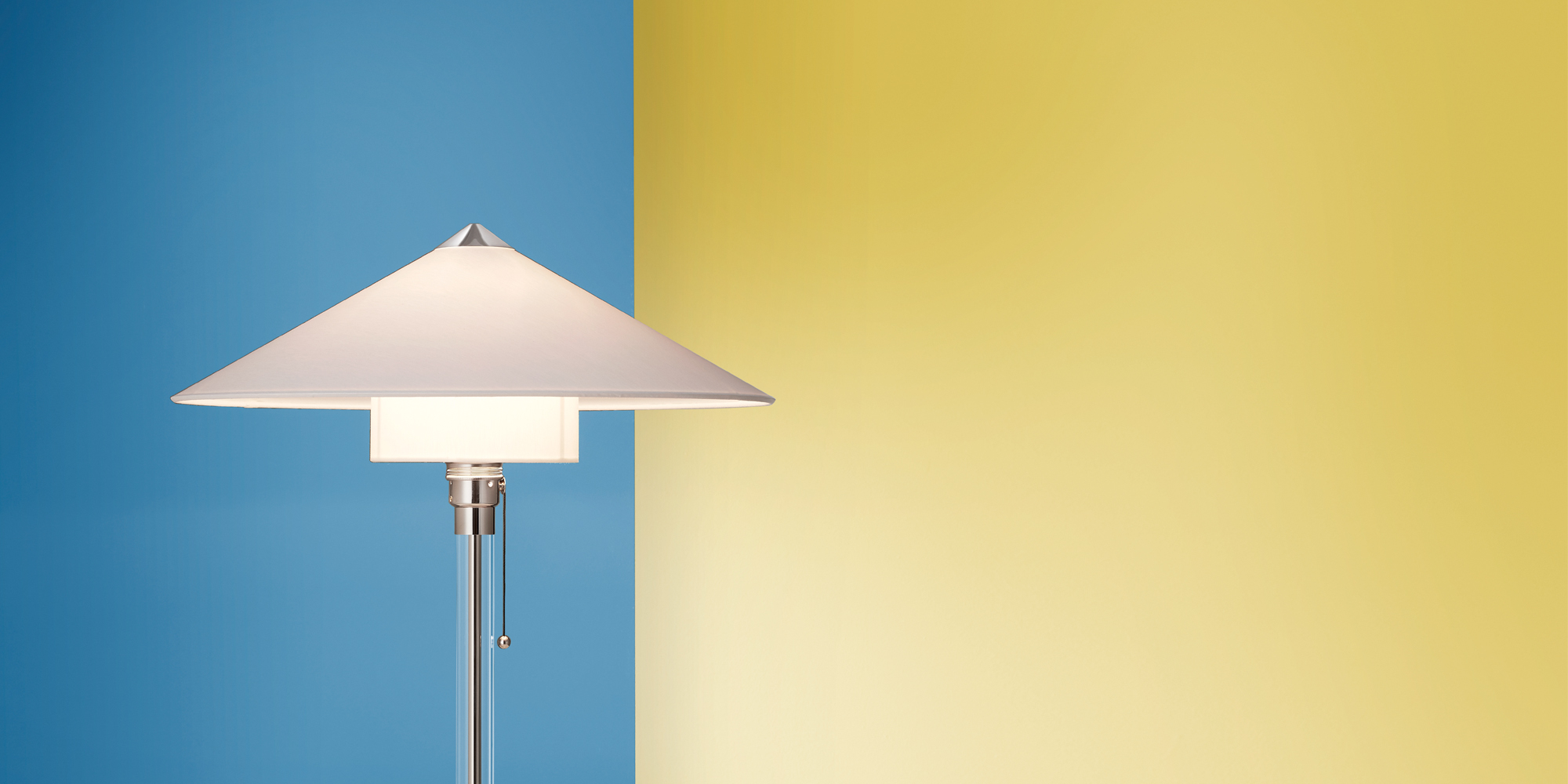 Während seiner Tätigkeit an der Bauhausschule in Weimar schuf Wilhelm Wagenfeld diese Steh- und Tischleuchten mit Stoffschirmen. Die optische Nähe zu den am Bauhaus entstandenen Tischleuchten zeigt Wagenfelds ständiges Experimentieren und die Suche nach der endgültigen Form, die oft schon vor dem eigentlichen Ende der Entwicklung gefunden wird.