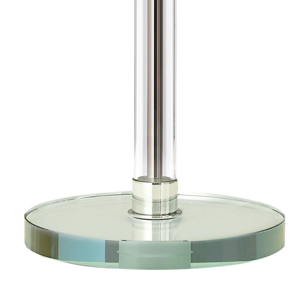 Tischleuchte aus vernickeltem Metall, Glasschaft, Glasfuß und Kartonschirm mit geradem Unterschirm.