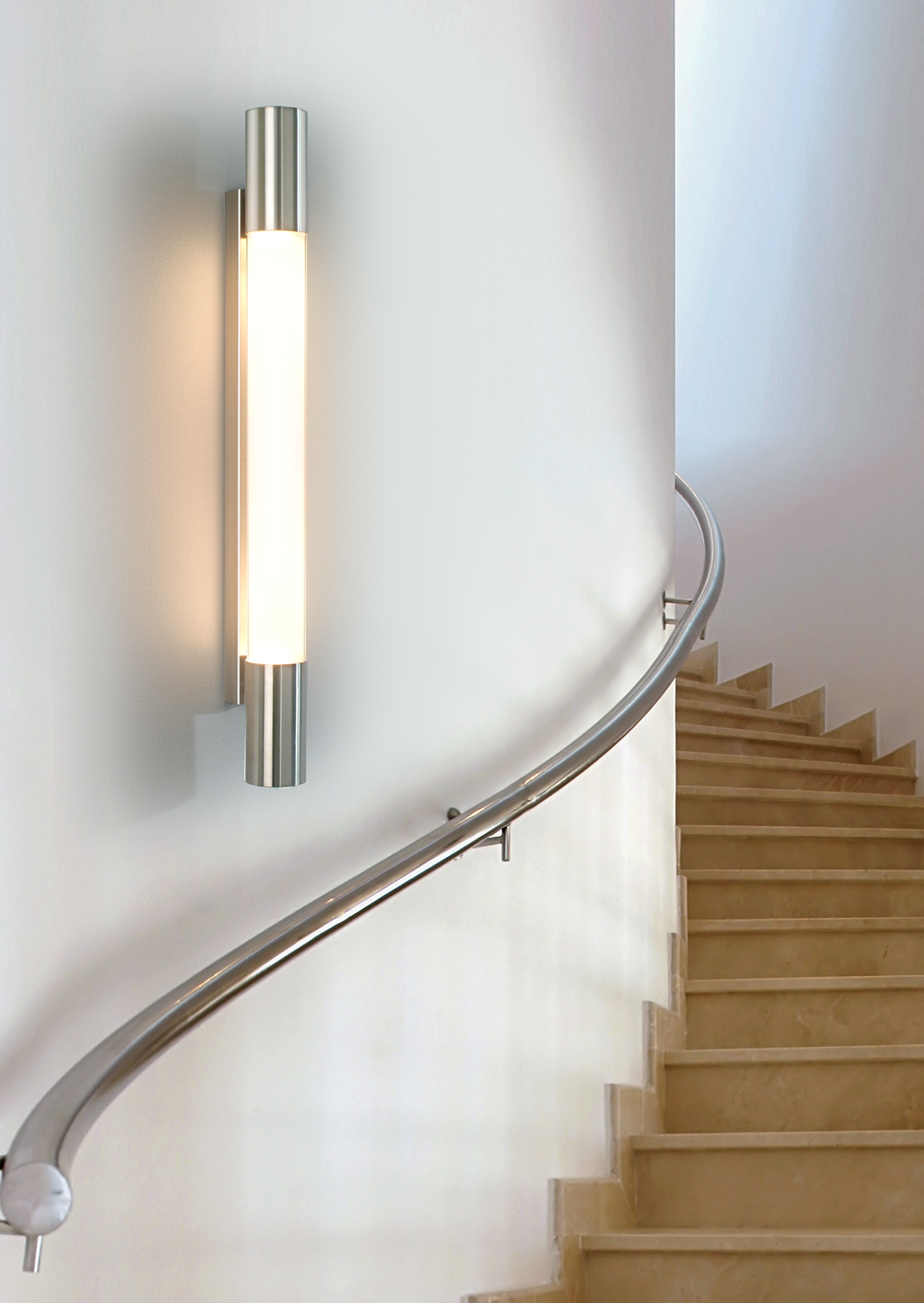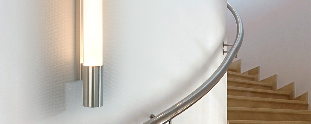 Die Wandleuchte eignet sich sehr gut zur Einfassung von Spiegeln, an Treppenaufgängen oder in Fluren. Die edle Wandleuchte ist ausschließlich für die senkrechte Montage geeignet. Eingefasst in zwei mattierte Edelstahlzylinder verteilt ein spezieller Kunststoffdiffusor das Licht breitflächig und sehr gleichmäßig.