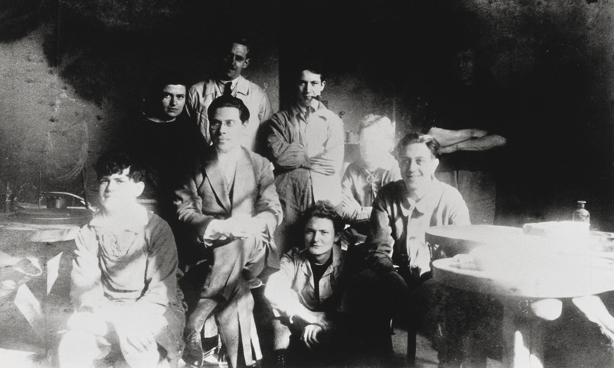 Gruppenbild in der Metallwerkstatt am Bauhaus in Weimar, um 1924. Vorne: Gerhard Vallentin, Laszlo Moholy-Nagy, Wilhelm Wagenfeld und Otto Rittweger Hinten: Marianne Brandt, Christian Dell, Josef Knau, Max Krajewski und die Arme von Hans Przyrembel